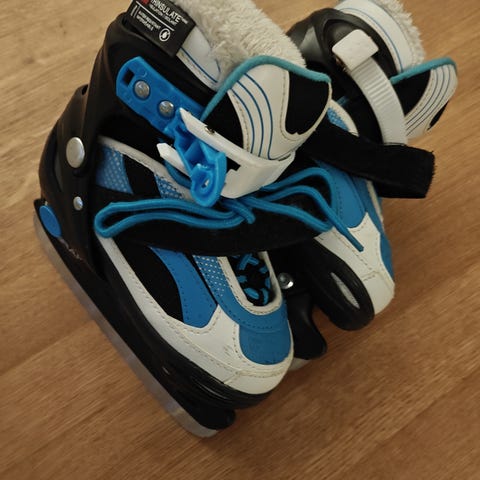 Säädettävät lasten jääkiekkoluistimet, hyvässä kunnossa, mutta kengän kärjessä on pientä pintahalkeilua.