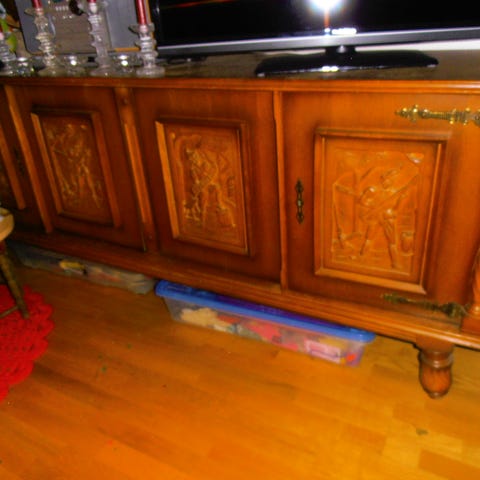 Vanha antiikkinen tammisenkki, mitat leveys 188 cm, syvyys 57 cm ja korkeus 93 cm. Täyttä puuta ja hyvin painava. Kunto ehjä ja hyvä, käytön ja elämän jälkiä toki on. Kolme vetolaatikkoa ja kolme kaappia, joissa välihylly kussakin. Avaimia lukkoihin ei ole, mutta kaikki lukot ovat auki.