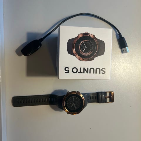 Suunto 5 urheilukello, copper väri, varustettu barometrillä ja GPS-toiminnolla. Kello on suunniteltu urheiluun ja ulkoiluun, ja se tarjoaa tarkat mittaukset aktiivisuudesta ja ympäristöolosuhteista. Mukana latauskaapeli.