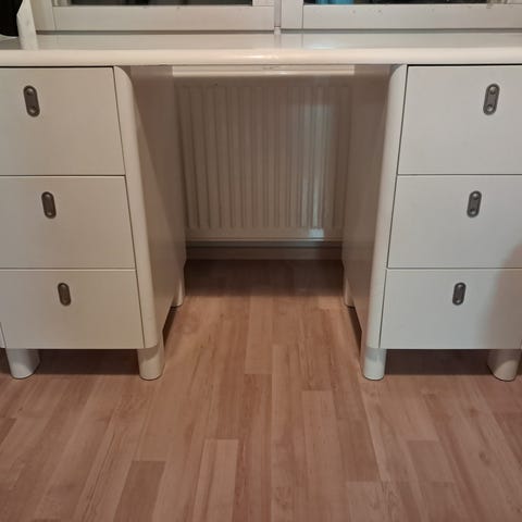 Valkoinen työpöytä/koulupöytä, neljä vetolaatikkoa. Pöydän kannessa sekä etureunassa kulumaa.
