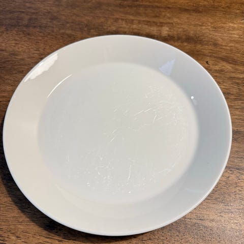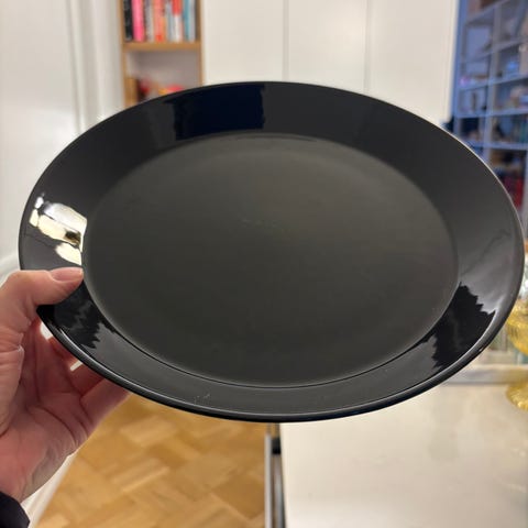 7kpl mustia Iittalan Teema lautasia, halkasija 26cm. Lautasessa näkyy käytön jälkiä, kuten naarmuja, lohkeama yhdessä lautasessa ja muutamassa lasitus kulunut pohjasta.