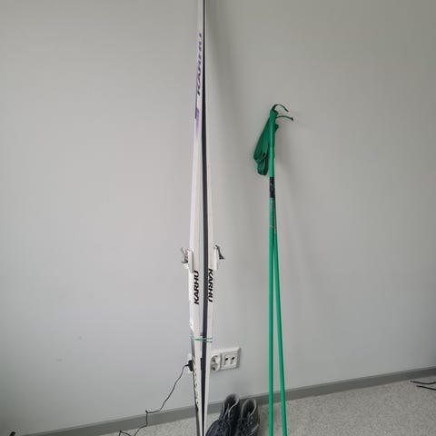 sukset 1,65m. sauvat 1,18m. kengät koko 40. Sukset on vahattu joulukuussa 2025. Sauvat voidaan käyttää myös vaellussauvoina. Hiihtoa varten riittää, että irrotat mustan kumikahvan.