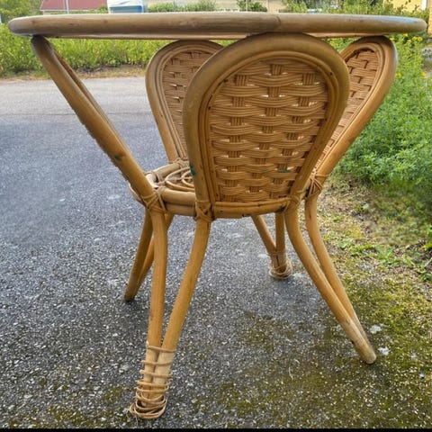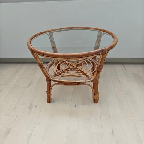 Myydään erittäin hyvä rottinki lasipöytä.Pöydän leveys 80cm, korkeus 55cm.