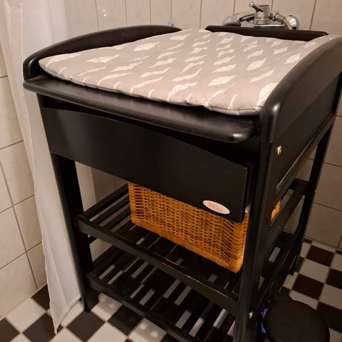 Myydään hyväkuntoinen hoitopöytä. Ostettu uutena. Pientä maalin kulumaa jos tarkkaan katsoo alustan etuosaan. Väri harmaa ja rimoitus tammi.