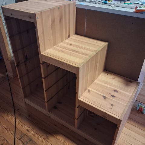 Kokonaisuus koostuu neljästä valkoisesta rungosta ja kuvan mukaisista laatikoista. Vain yksi pieni vaurio kaksi runkoa toisiinsa kiinnittävästä ruuvista (kuva). Tämä jää piilloon, jos ko. runko asetetaan rinnakkain toisen kanssa. Muutoin oikein hyvässä kunnossa. Uutena kokonaisuuen hinta arviolta noin 240€.