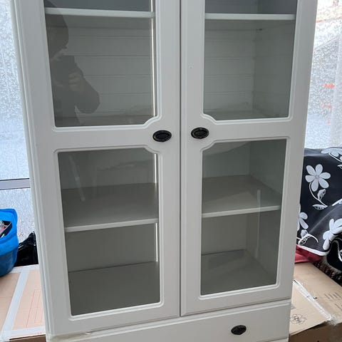Mitat: 107 x 40 x 158 cm. Kirkkaat lasiovet ja tilavat umpiovikaapit alhaalla.