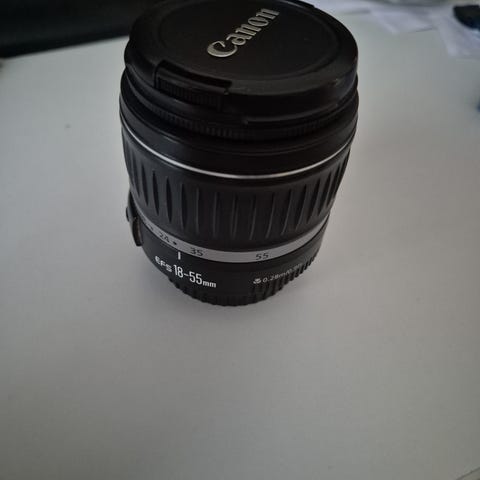 Canon EF-S 18-55mm objektiivi, joka soveltuu erilaisiin valokuvaustarpeisiin. Objektiivissa on kuvanvakain ja makrotila, joka mahdollistaa lähikuvauksen 0,25 metrin etäisyydeltä.