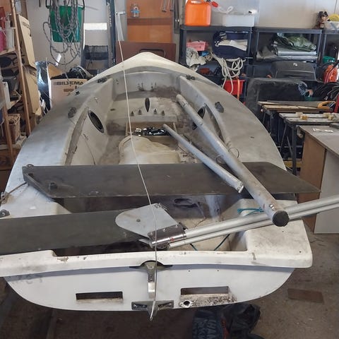 Kaksi keulapurjetta iso ja pieni, Kunto hyvä ei kulumaa, tukevat. Jääneet tarpettomaksi rullapurjeen myötä.