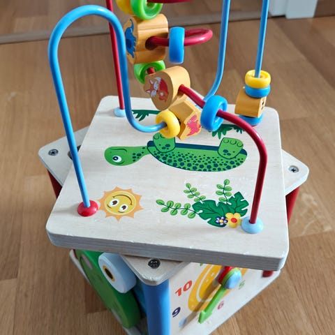 Seuraavalle leikkijälle puinen mato, joka kolisee ja mönkii kun sitä vetää perässä. Maalissa kulumaa, mutta täysin toimiva.