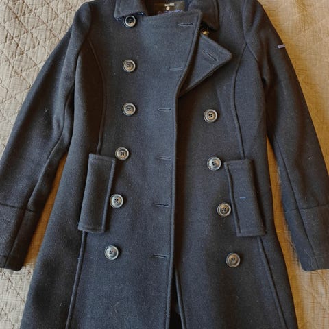 Ei ihan kovimmille pakkasille mutta kuitenkin suht lämmin. Kauluksen takaosa peitetty kiiltävillä paljeteilla hopean värisistä mustiin & kivalla kirjaillulla Superdryn logolla. Taskut sivuilla sekä povitasku.