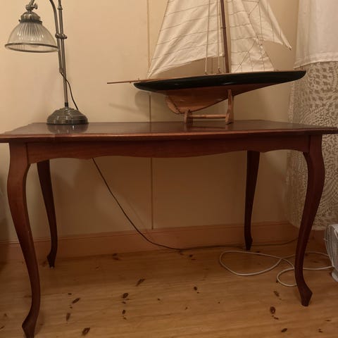 Luonnon puu reunalla koivusta leikattu kansi ja jalat kuusesta. Pöytä on lakattu huonekalulakalla.