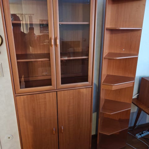 Hyväkuntoinen kirjahylly; koostuu kolmesta osasta joissa yhdessä hyllyt, yhdessä alaosassa laatikosto ja yhdessä alaosassa ovellinen kaappi. Osia voi käyttää erikseen tai yhdistää yhdeksi kirjahyllyksi.