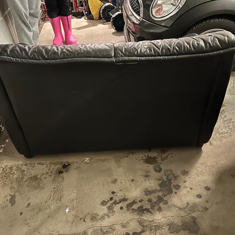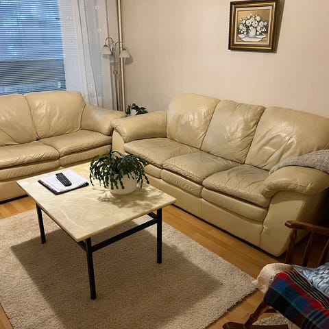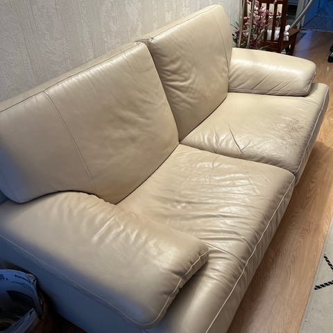 Annetaan valkoinen nahkainen sohva. Kulumaa on. Katsothan lisäkuvat