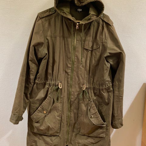 Oliivinvihreä topattu hupullinen parka. Takissa vetoketju ja nepparikiinnitys, säädettävä vyötärökiristys, hihansuissa resorit. Edessä neljä taskua joissa nepparikiinnitys. Takaa vähän pidempi pyöristetty helma. Ehjä.