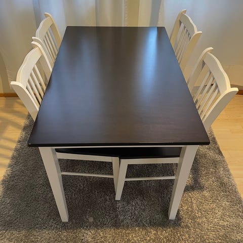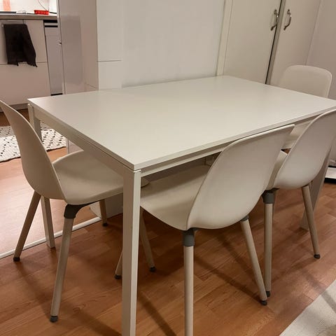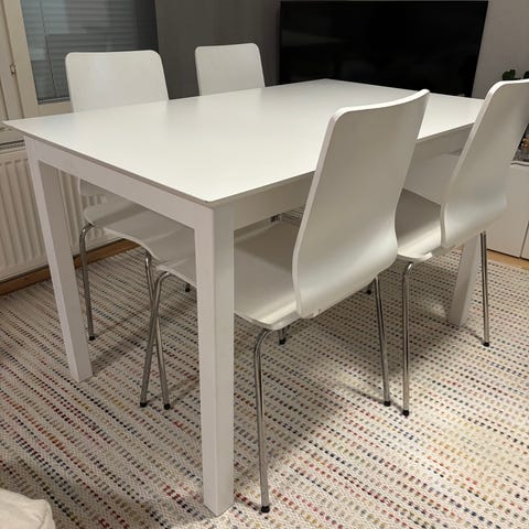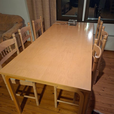 Myydään siistikuntoinen ruokailuryhmä. Pöydän pituus 120cm + jatkopala 30cm, leveys 83cm leveämmältä kohdalta.