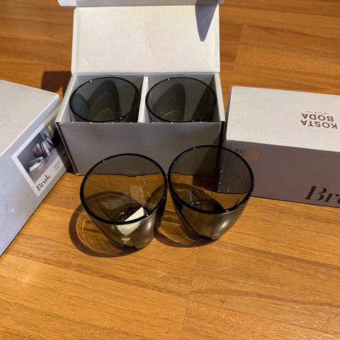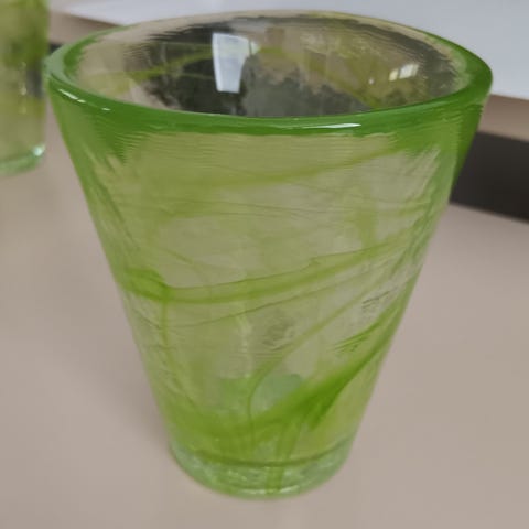 Lasit on tehty käsityönä eli jokainen lasi on hieman eripaksuinen. Halkaisija on kaikissa n. 4,8 cm ja korkeus n. 11,5 cm.