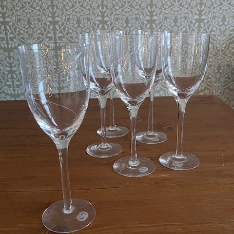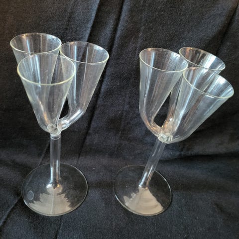 Kosta Bodan snapsilasit (Google lensin mukaan), joissa jokaisessa eri värinen lasipallo jalkana. Lasipallojen sisällä on ilmakuplia.