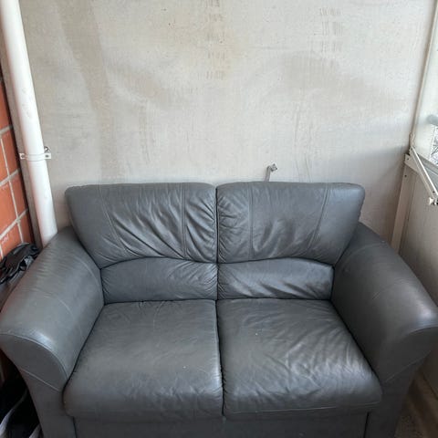 Parhaat päivänsä nähnyt vaalea keinonahkasohva; selkä- ja käsinojissa poimuja ja paikoin hiukan tummentumaa. Tummentumia ei ole yritetty kummemmin poistaa, voisivat irrota huolellisemmalla puhdistuksella tai kovemmilla aineilla.