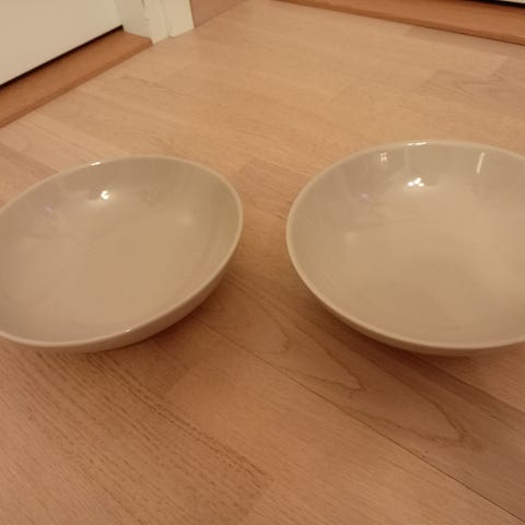 2 kpl beigejä syviä lautasia. Halkaisija 20,5 cm ja korkeus 6 cm. Ehjiä ja hyvässä kunnossa.