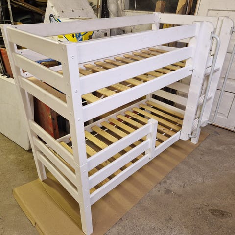 Kaksiosainen kerrossänky, voidaan jakaa kahdeksi erilliseksi sängyksi. Mukana kiinnitys osat ja tikkaat, voidaan kasata kerrossängyksi. Sänky osina, kaikki ruuvit mukana