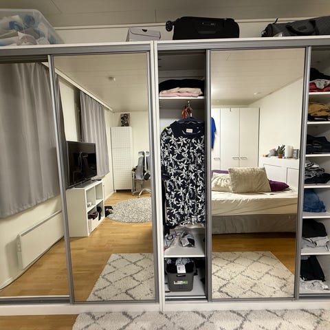Kuvien mukainen vaatekomero kahdella hyllyllä, laadukas tukeva peiliovi.