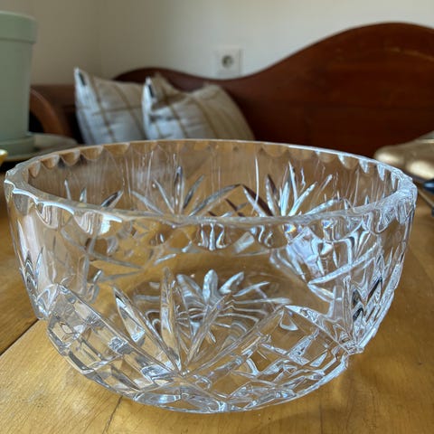 Pyöreä lasinen tarjoilukulho. Halkaisija 20 cm, korkeus 8 cm. Ehjä ja hyvässä kunnossa.
