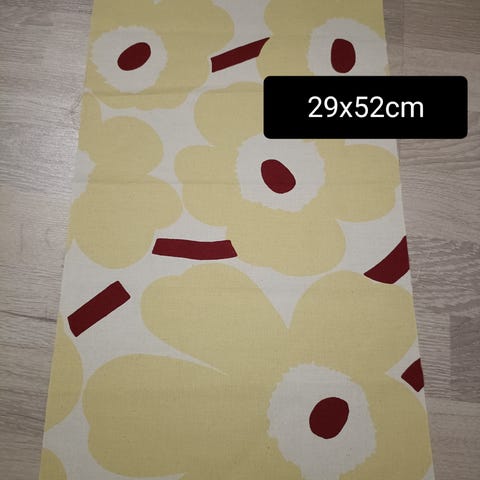2 kpl Marimekon Karkumatka-kangaspaloja. Molempien palojen koko n. 70 x 215 cm. Puuvillaa. Esim. verhoiksi tai muihin ompeluprojekteihin!