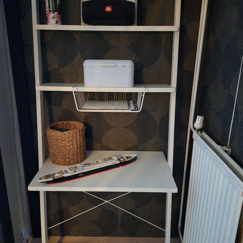 Kuvan korkeakiiltoinen työpöytä kahdella laatikolla. Käytönjälkiä on, mutta yleisilme hyvin siisti. Kuljetus 20km säteellä 10€.