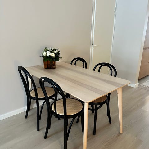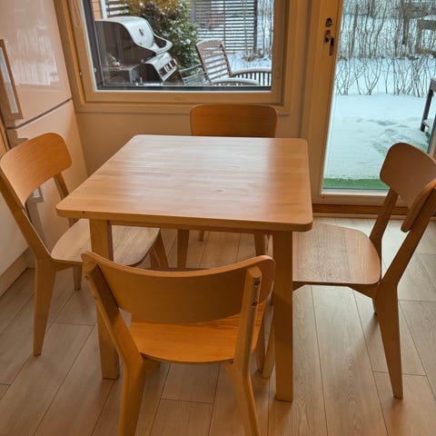 Myydään Ikean Lisabo ruokapöytä, joka hyvässä käytetyssä kunnossa. Yhdessä kulmassa pieni lohkeama, joka näkyy kuvassa. Lisäksi myynnissä 4kpl Ikea Vilmar tuoleja. Tuoleissa pieniä käytönjälkiä.