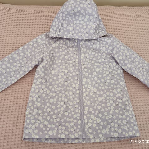 Ticket to Heaven -välikausitakki. Valkoisella pohjalla violetin, turkoosin ja ruskean väristä ympyröitä. Koko 116 cm.