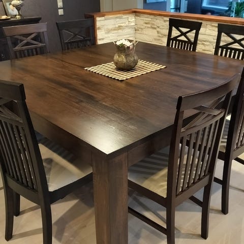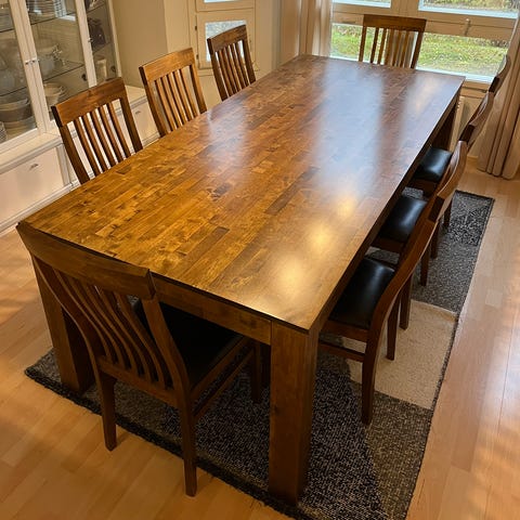 12 tuolia, pöytä jatkolevyllä ja astiakaappi.