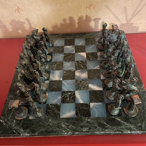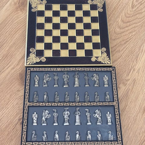 Metallinen shakkisarja, jossa on historiallisia hahmoja. Sarja sisältää pelinappulat kahdessa eri värissä, jotka on sijoitettu punaisen samettipinnan päälle puulaatikossa. Nappulat ovat yksityiskohtaisesti muotoiltuja ja edustavat erilaisia hahmoja.