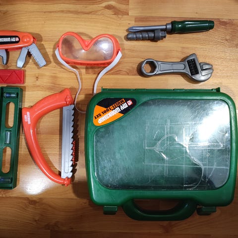 Myydään korillinen muovisia leluraksatyökaluja pikkurakentajalle.