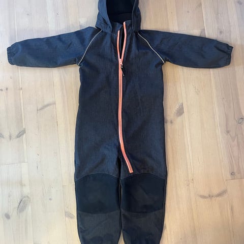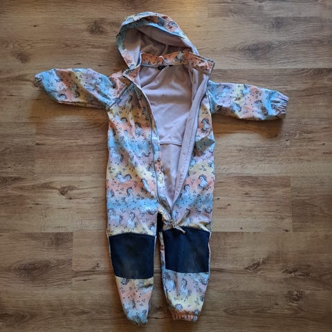 Haalari on mukava päällä, helppo pukea ja sopii erinomaisesti ulkoiluun, leikkeihin ja päiväkotiin. Materiaali on kestävää ja likaa hylkivää, joten haalari säilyy hyvännäköisenä pitkään. Vetoketjut, kumilenksut ja saumat ovat ehjät, eikä haalarissa ole reikiä tai tahroja, vain pientä kulumaa polven saumoissa.