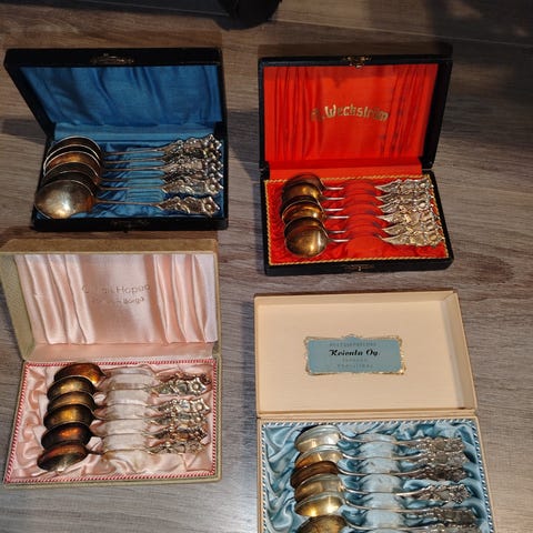 Ruusulusikoita alpakkaa, shottilasit hopeanväriset