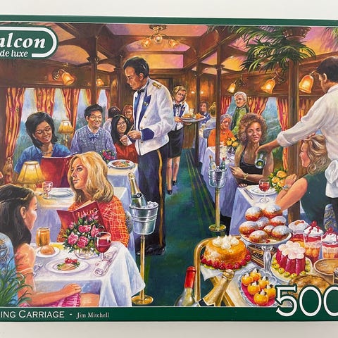 Falcon The Dining Carriage 500 palan palapeli sisältää 500 palasta. Palapelin kuva-aiheena on ravintolavaunu, jossa ihmiset nauttivat ruokailusta.