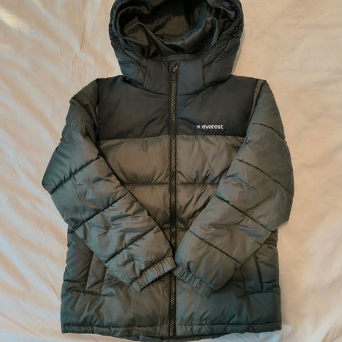 Everestin vaalean roosan värinen/tummanharmaa toppa-/laskutakki koossa 128 cm. Takissa ei ole erillistä hissilipputaskua hihassa.