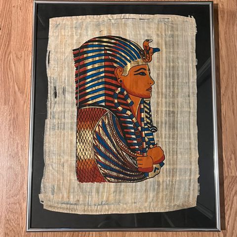 Kaksi kehystettyä Egyptiläistä papyrus-taidetta, joissa esitetään perinteisiä egyptiläisiä hahmoja. Taulujen koot: 47 x 56 ja 42 x 52 cm. Maalaukset virheettömät, mutta kehyksissä vaurioita.