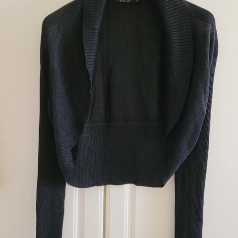 H&M musta neulebolero, koko M. Kudonnassa hiukan kimaltelevaa lankaa. Pesulappu poistettu, mutta muistaakseni langassa myös hiukan mohairia. Kaunis juhlamekon tai paidan päällä. Koko M, mutta menee hyvin myös S ja L koolle.
