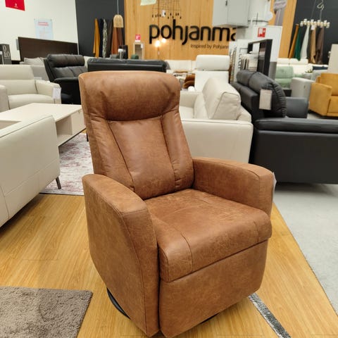Pohjanmaan Kalusteen valmistama mekanismituoli akulla. Sähköisen mekanismin avulla saat portaattomasti säädettyä asennon juuri kuhunkin hetkeen sopivaksi.
