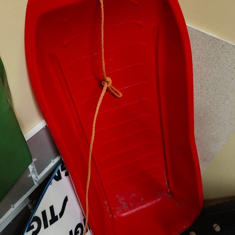 Bilteman punainen pulkka. Toinen kahva on poissa, muuten ihan ehjä.