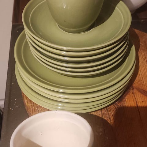 Astiastosetti, joka sisältää ruskean värisiä keramiikka-astioita. Settiin kuuluu useita lautasia ja kuppia, joissa on käsinmaalattu ruskea ja beige sävyinen lasitus. Astiat soveltuvat keittiökäyttöön ja tarjoiluun.