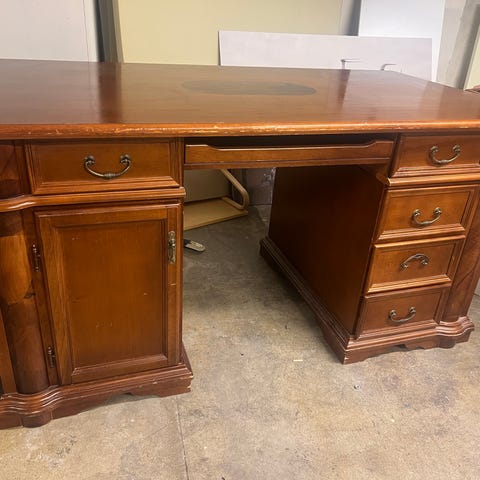 Siro työpöytä luultavasti 1950-luvulta. Tämä on korkeudeltaan normaalia matalampi ja sopiikin hyvin esim. lapsen pöydäksi tai sivupöydäksi. Pöytä syvenee molempia reunoja kohti ja on keskeltä syvyyssuunnassa pienempi. Pöydässä on yhteensä kuusi pientä laatikkoa.