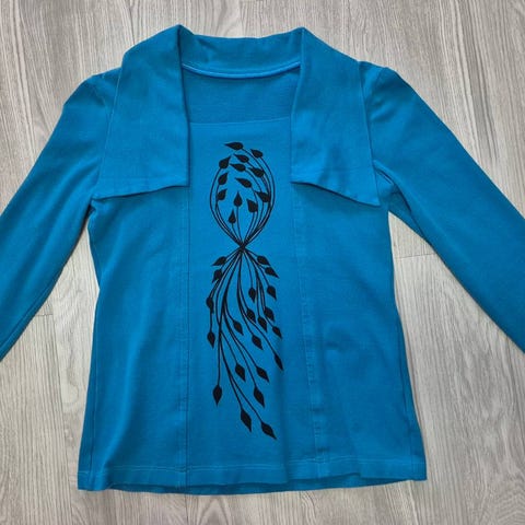Paidan mitat: kainalosta kainaloon n. 49 cm, olkapäästä hihansuuhun n. 58 cm, hartiasta helmaan n. 67 cm.