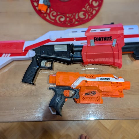 Nerf lasten leluaseet eri malleja ja värejä. Setti (8kpl) sisältää useita erilaisia leluaseita, jotka on valmistettu muovista. Ei sisällä panoksia (paitsi Fortniteen 2kpl).