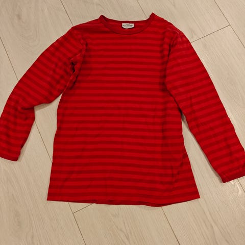 Marimekko T-paita, koko 152-156. Raidallinen kuosi, väriltään kirjava. Materiaalina puuvilla. Sopii arkipukeutumiseen. Pieni reikä takapuolella sauman lähellä,katso kuva.