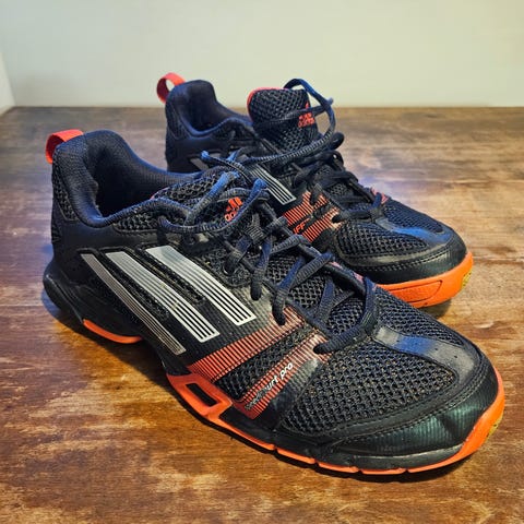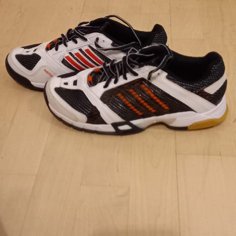 Adidas sisäkengät pitävällä kumimaisella pohjalla, koko 40 2/3, musta väri. Kengissä on musta päällinen ja hopeiset raidat. Päällinen nahkaa. Soveltuvat monipuoliseen käyttöön. Olivat itsellä muutaman kerran käytössä kun kokeilin aerobicia ja kuntonyrkkeilyä. Toimivat hyvin.