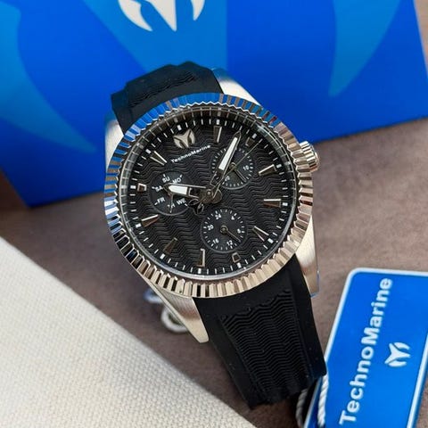 Upea miesten rannekello Technomarine-merkkiseltä, referenssinumerolla TM-120015. Kellossa on kvartsikoneisto ja se näyttää sekunnit 6:n kohdalla. Selkeä luettavuus kontrastin ansiosta, jossa musta tausta ja kontrastiset yksityiskohdat.
