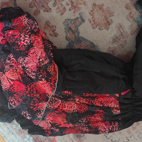 Käytetty kahdesti ja takareikää (tarpeiden tekemistä varten) laajennettu yhdellä pykälällä. Laajentamista varten on haalarissa lisääkin "pykäliä", joista leikataan aukkoa suuremmaksi. Moitteeton kunto.