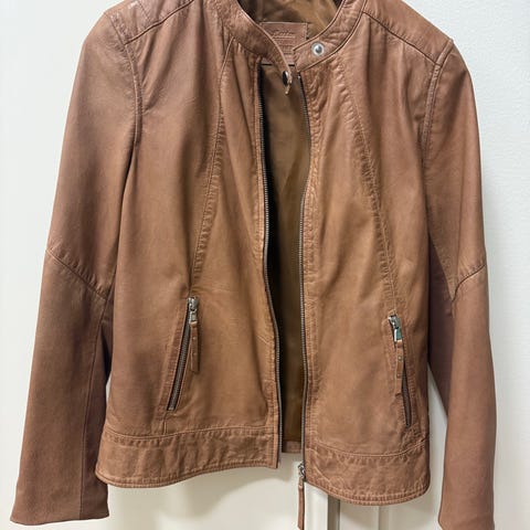 Hyvässä kunnossa oleva vaalea nahkatakki.